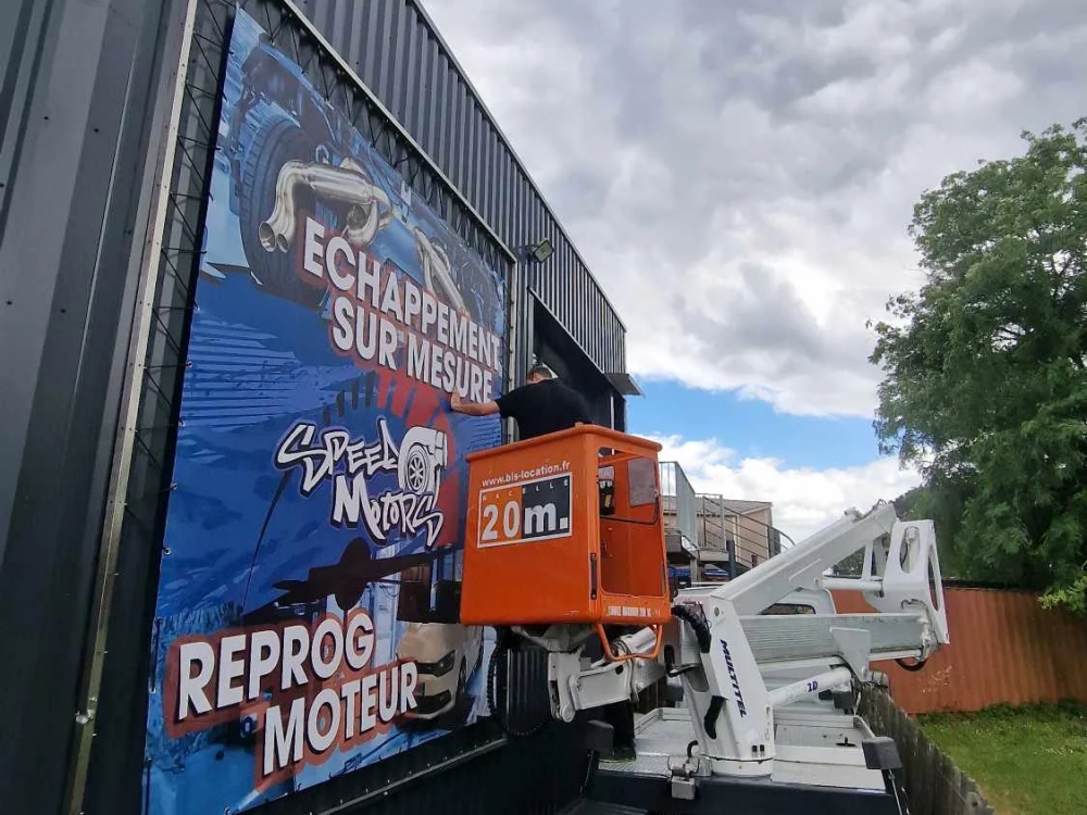 Enseigne, totem, drapeau, PLV, bâche pvc, panneau de chantier, signalétique, marquage vitrine et véhicule, etc...
